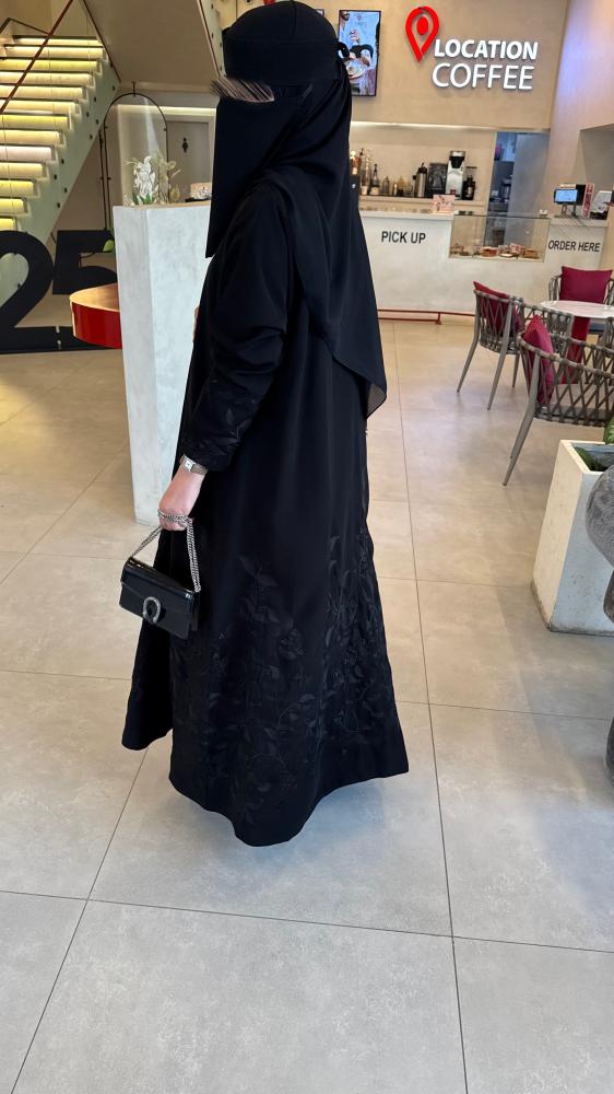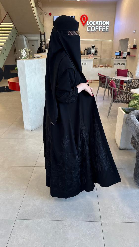 قماشها كريب ملكي ناعم، وقصة نص كلوش تضمن لك حركة مريحة وأناقة ما تتصنع. التطريز على القماش يضيف لمسة راقية بدون ما تكون بارزة بزيادة. عباية عملية وأنيقة في كل وقت.